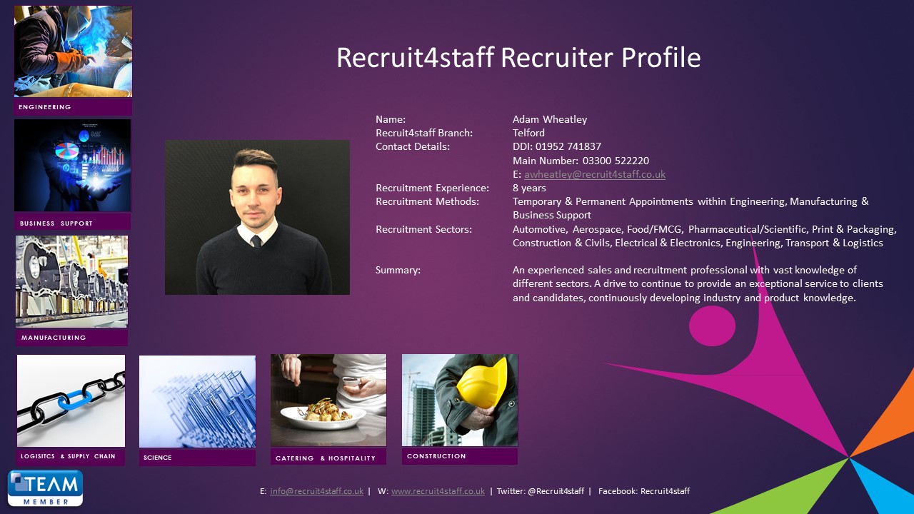 Due to continued success, we are pleased to announce our newest Team Member Adam Wheatley who has joined Recruit4staff Telford branch.
